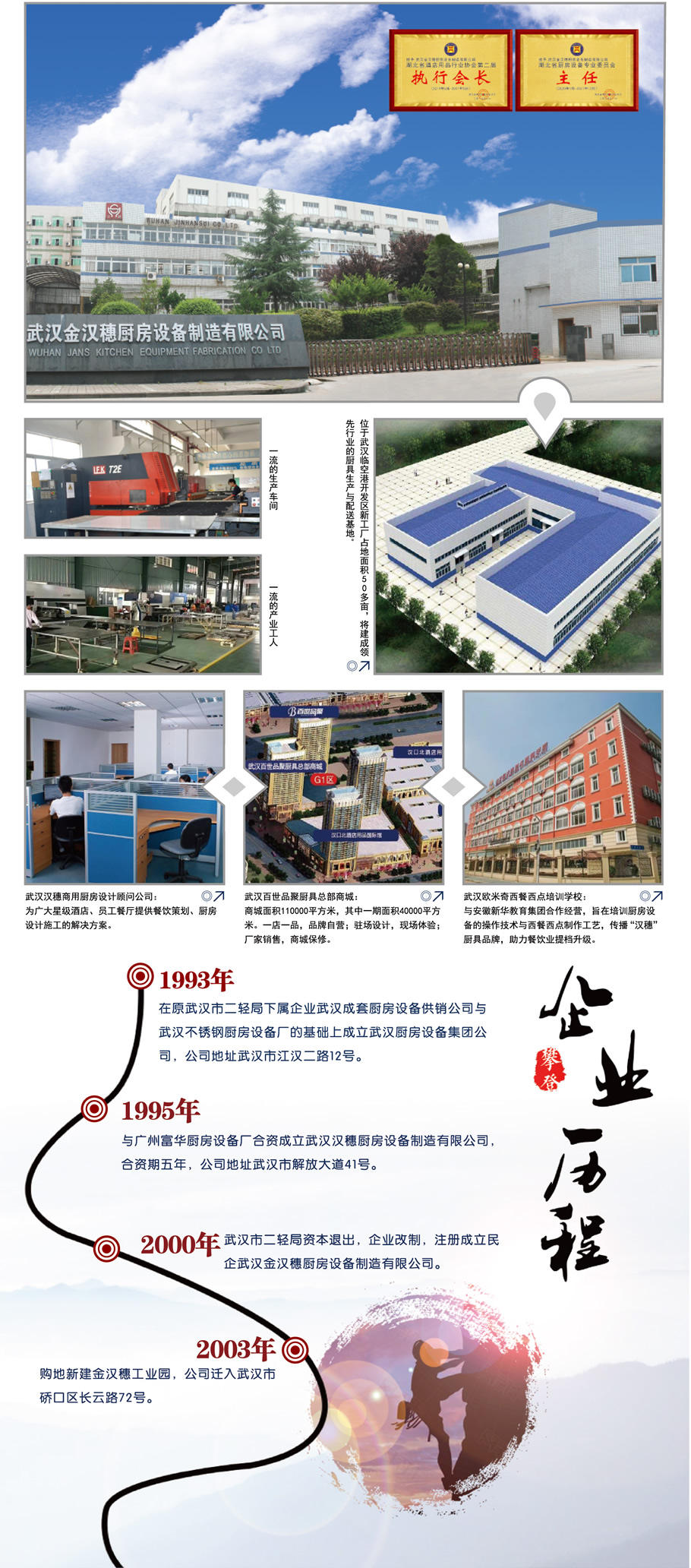 武漢金漢穗廚房設(shè)備制造有限公司是國內(nèi)大型廚房設(shè)備制造企業(yè),是湖北省酒店用品行業(yè)協(xié)會(huì)執(zhí)行會(huì)長單位,是湖北省廚房設(shè)備專業(yè)委員會(huì)主任單位。經(jīng)過二十多年的發(fā)展,公司已形成設(shè)計(jì)、生產(chǎn)、安裝一條龍及產(chǎn)、學(xué)、研一體化的企業(yè)綜合體;公司在做強(qiáng)做大廚房設(shè)備主業(yè)的同時(shí),并合資經(jīng)營武漢百世品聚廚具城、武漢漢穗商用廚房設(shè)計(jì)顧問公司及武漢歐米奇西餐西點(diǎn)培訓(xùn)學(xué)校。